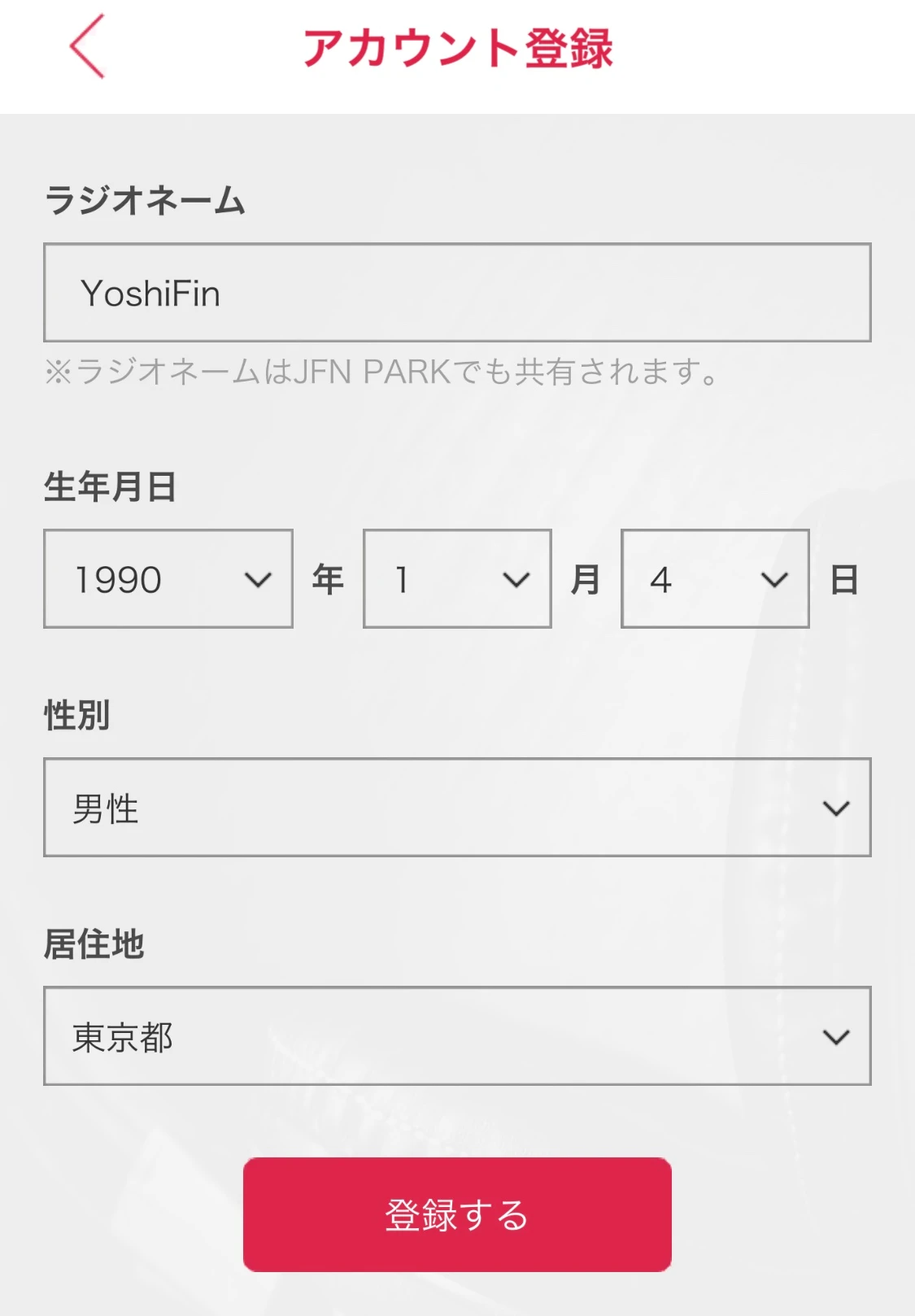 ①アプリを開くと左上のような登録画面が出てくるので,適当に入力して登録して下さい!